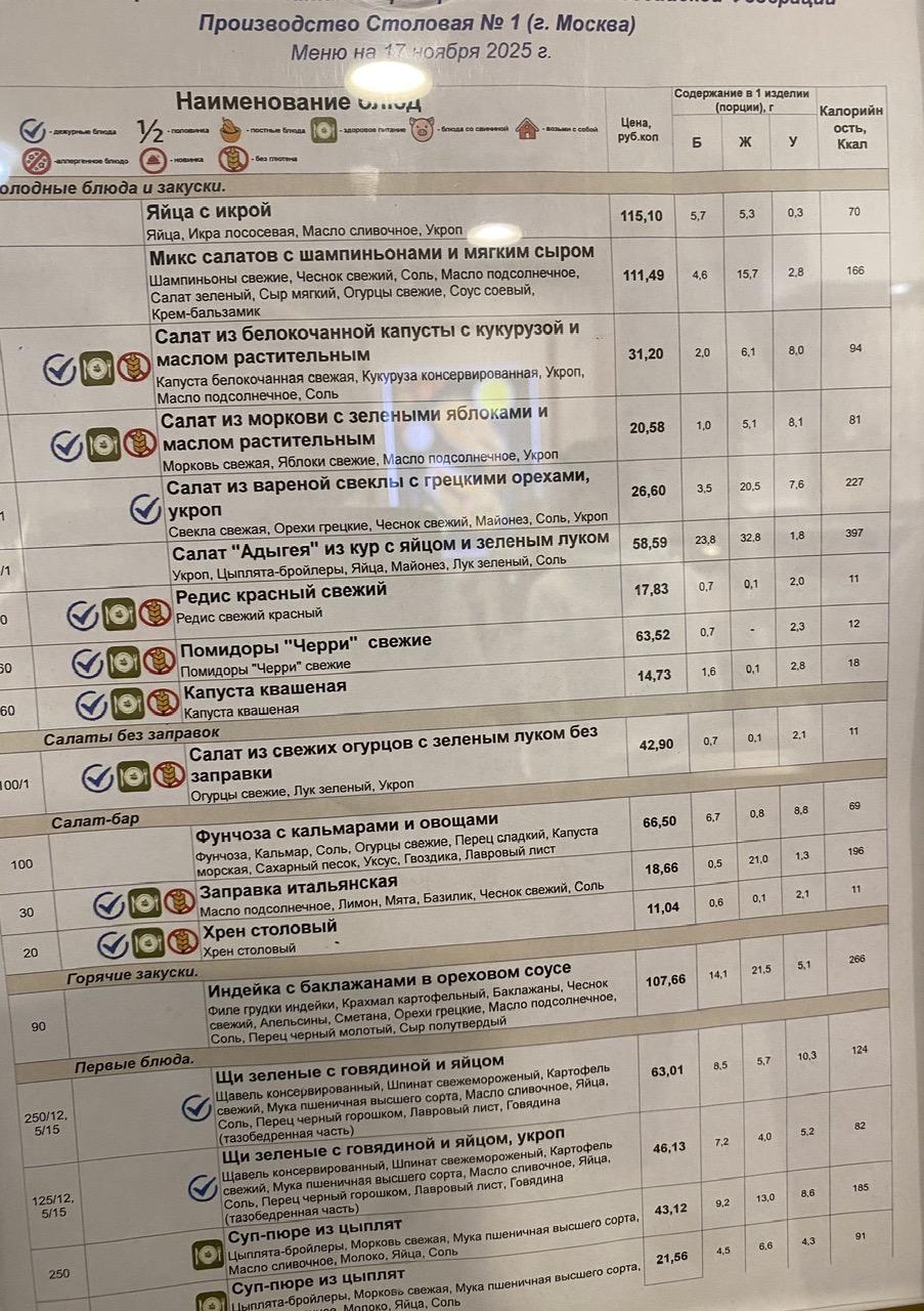Опубликовано ноябрь 19, 2025 в 05:44Нояб 19, 2025 Автор В 19.11.2025 в 08:32, Бормоглот сказал: Обзоры Вкусно. Порции не самые большие. Женщинам можно набирать по калориям из крайнего столбца. Производство Столовая №1. Яичко вареное с икрой и жюльен прекрасны. Мясо на супе не экономят, точно в меру. Профессионалы. Поднос убираешь сам.